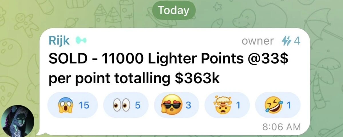 由于 Hyperliquid 的成功先例(曾空投 31%代币给用户),市场普遍预期 Lighter 将把积分按一定比例兑换成代币空投,这种预期催生了积分场外交易的热度:有截图显示,Lighter 积分在 OTC 市场的成交价约为 33 美元/点,累计成交额已达 36.3 万美元。由于尚未披露积分的总供应量,目前难以给出合理的代币估值。但我们可以参考 Hyperliquid 的路径:彼时,Hyperliquid 向社区空投了 30% 的代币,上线时的估值约为 30 亿美元。如果 Lighter 采取类似的分配策略,那么其整体估值大概率也会在≥30 亿美元这一档次。虽然空投的最终估值仍然存在高度不确定性,但积分的投机交易已经成为推动 Lighter 成交量和 OI 增长的重要驱动力。