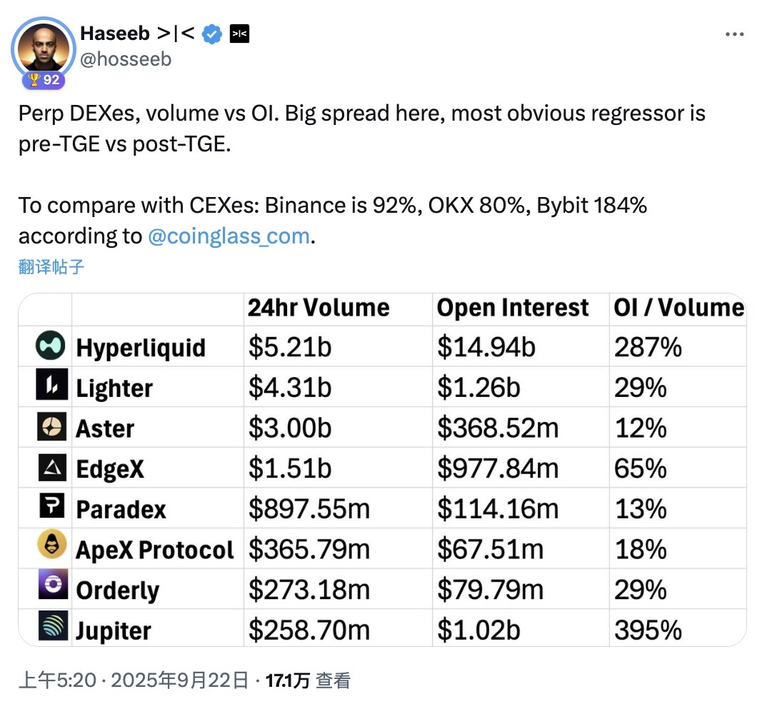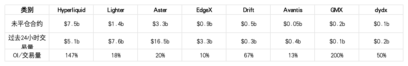 一个主要衡量健康的流动性指标的维度是是未平仓合约量与交易量之比(Open interest vs Volume),根据 Coinglass 提供的 OI/Volume 数据,Binance 为 92%,OKX 为 80%,Bybit 为 184%。相比之下,许多依靠代币激励的 Perp DEX 这个比率很低,说明其交易活动更多是刷量而非真实持仓。 但是这只是也不能作为唯一参照标准还是要拉长时间周期以及具体看 主要活跃地址的行为 (近期 OI to volume ratio 成为很多项目社区互相攻击的叙事比如 hyperliquid 和 lighter )