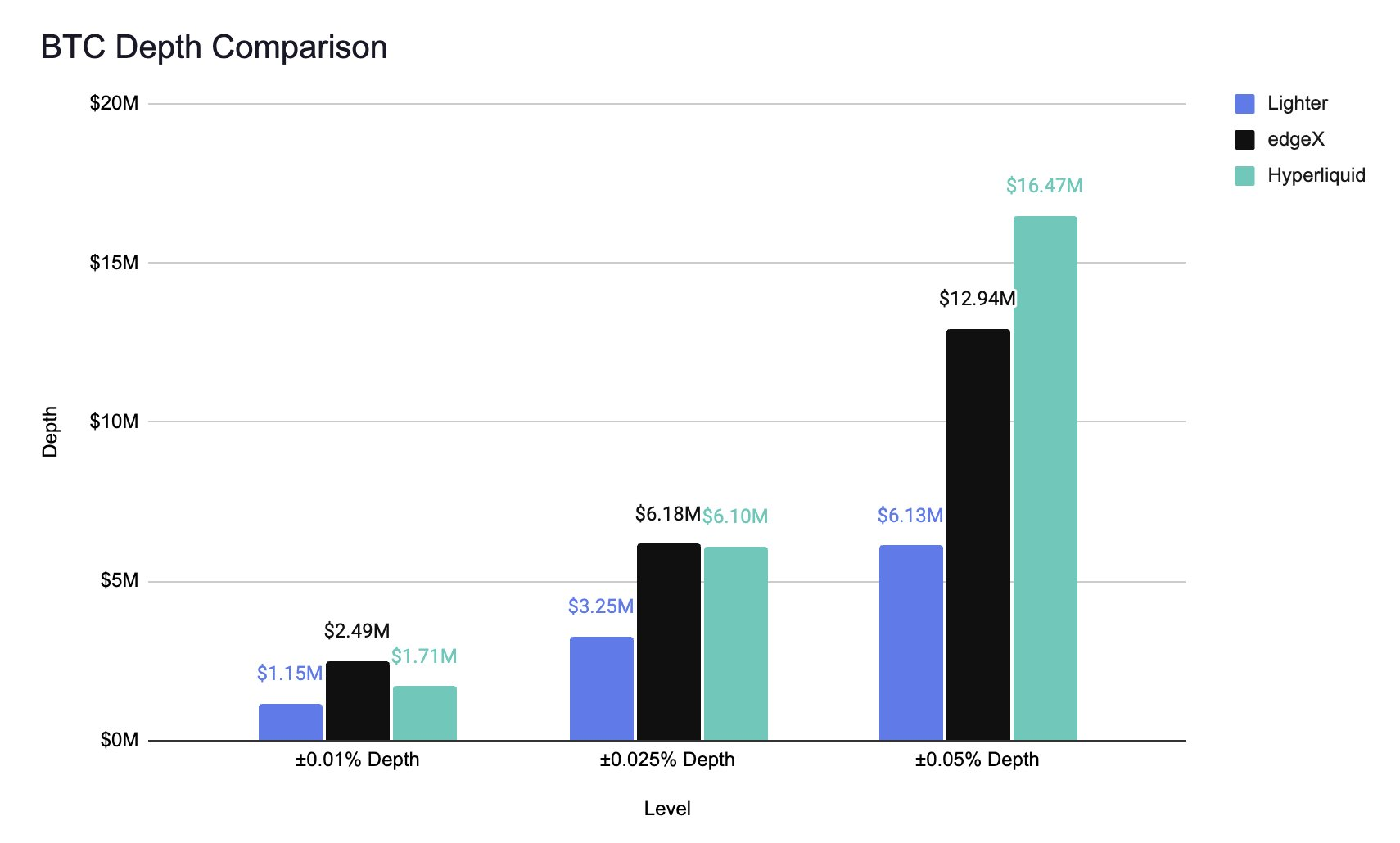 图:BTC 交易对深度对比(Hyperliquid, Lighter, EdgeX) @andyandhii 在一次测试中使用来自 Lighter、EdgeX 与 Hyperliquid 的 1 小时数据进行对比。结果显示 Hyperliquid 在处理超过 1600 万美元的大额订单时仍能保持深度,而在 600 万美元订单规模下的表现与 EdgeX 相当,这说明 Hyperliquid 的确是大户交易的最佳场所。