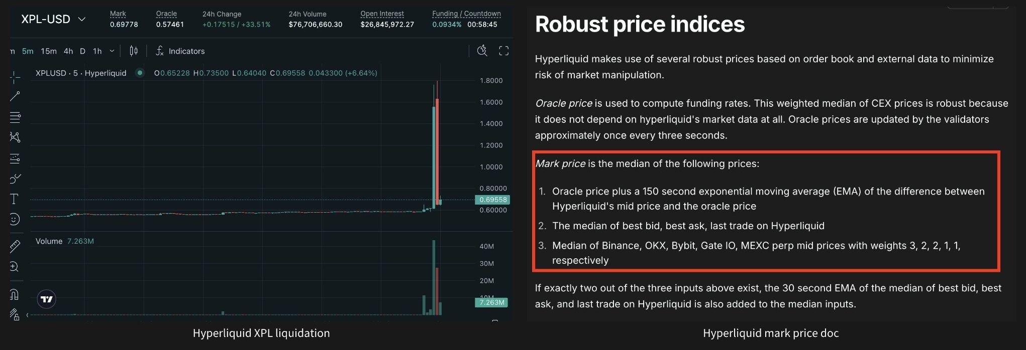 图:Hyperliquid 的 XPL 事件:2025 年 8 月 26 日,一个巨鲸(Whale)在几分钟内将 XPL 代币的价格从 0.6 美元拉高到 1.8 美元,导致价值 2500 万美元的空头仓位被清算,而同期 CEX 的价格保持稳定。这是因为在“盘前市场”这种缺乏可靠外部价格来源的场景下,内部价格极易被操控。