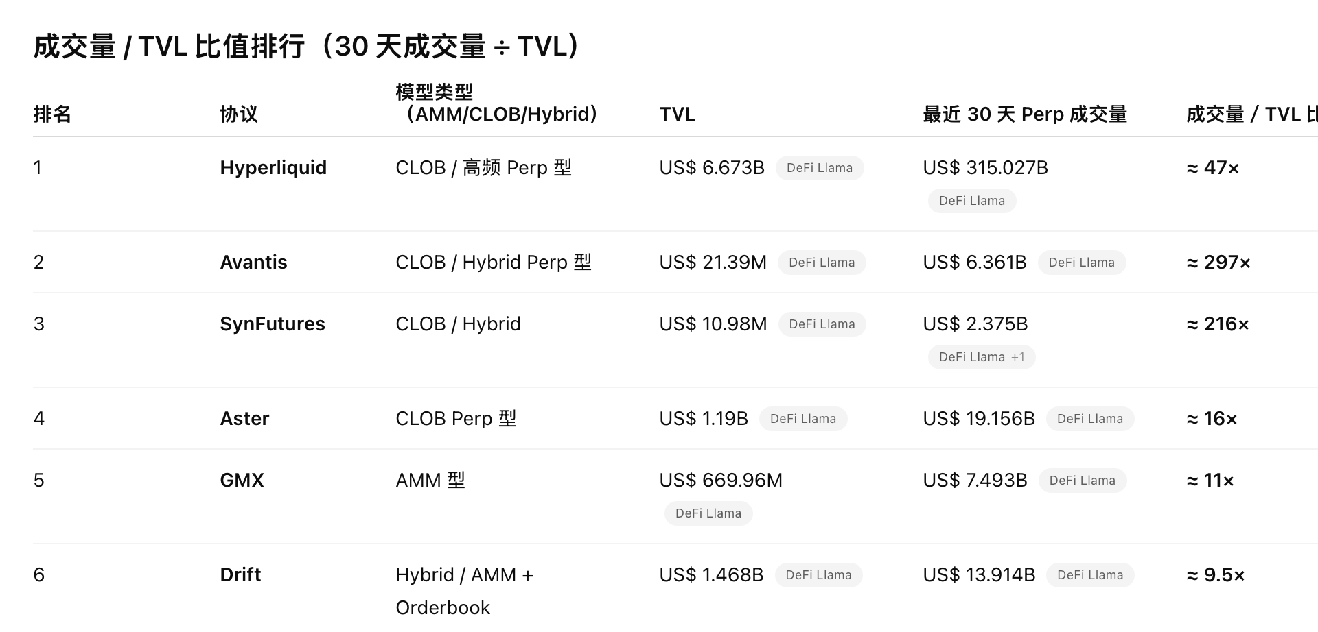 图:比值最高的是流动性沉淀较少但交易非常活跃、杠杆倍数 /保证金动用频繁的协议,如 Avantis 和 SynFutures,Aster 虽然 TVL 较大,其比值处于中间水平,说明其“交易活跃度”也很高,但比那些 TVL 小但交易量大的协议稳定性可能更好一些。