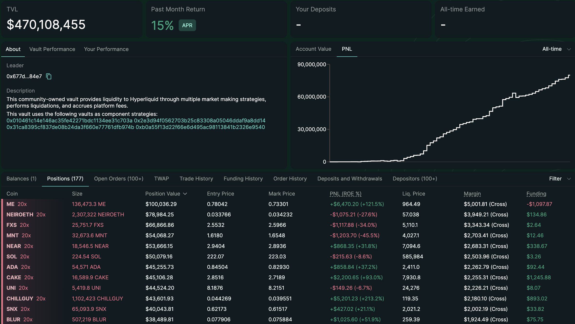 HLP 实现交易流动性的 Bootstrapping: Hyperliquid 首先建立了一套名为“做市金库”(Market Making Vaults)的框架,并由团队主导运营旗舰做市金库 HLP。创始团队亲自引导早期流动性,愿景是“民主化做市 Democratizing market making ”: HLP 不收取任何管理费用,P&L 按存款人份额比例分享(目前 P&L 在$80m)。策略目前在链下运行,但仓位、挂单、交易历史、存款和取款均实时链上可见,供任何人审计。