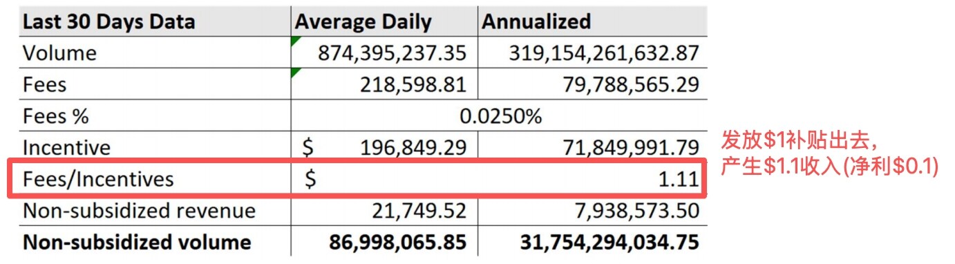 图:最近一篇推特上的文章 《Deadly Perp DEX Traps (and the Paths Out)》 披露一个团队如果收取 0.035% 的手续费,在分给做市商和返佣后,可能只剩下 0.015%。假设团队每月运营成本 50 万美元,需要每天至少 1.111 亿美元的 taker 吃单量才能保本