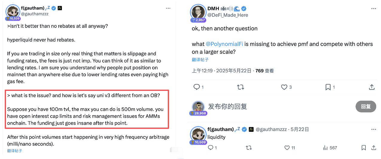 图: Polynomial founder Gautham 在一个讨论 order book vs amm 在 perp DEX 应用的帖子里也表达了类似的想法:AMM 池的规模也会限制交易规模,该团队是在 2021 年进入 decentralized deriviatives 市场。