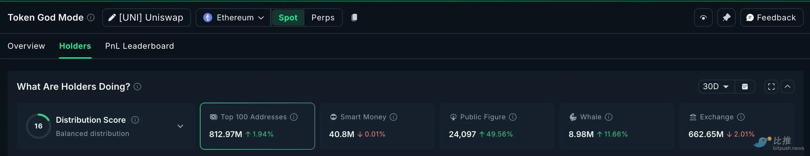 UNI: 过去一周巨鲸新增约 80 万枚(价值近$500 万美金),费用开关投票通过后,排名前 100 的地址共持有 898 万枚 UNI,显示出强劲的吸筹势头,而交易所的供应量却在持续减少。