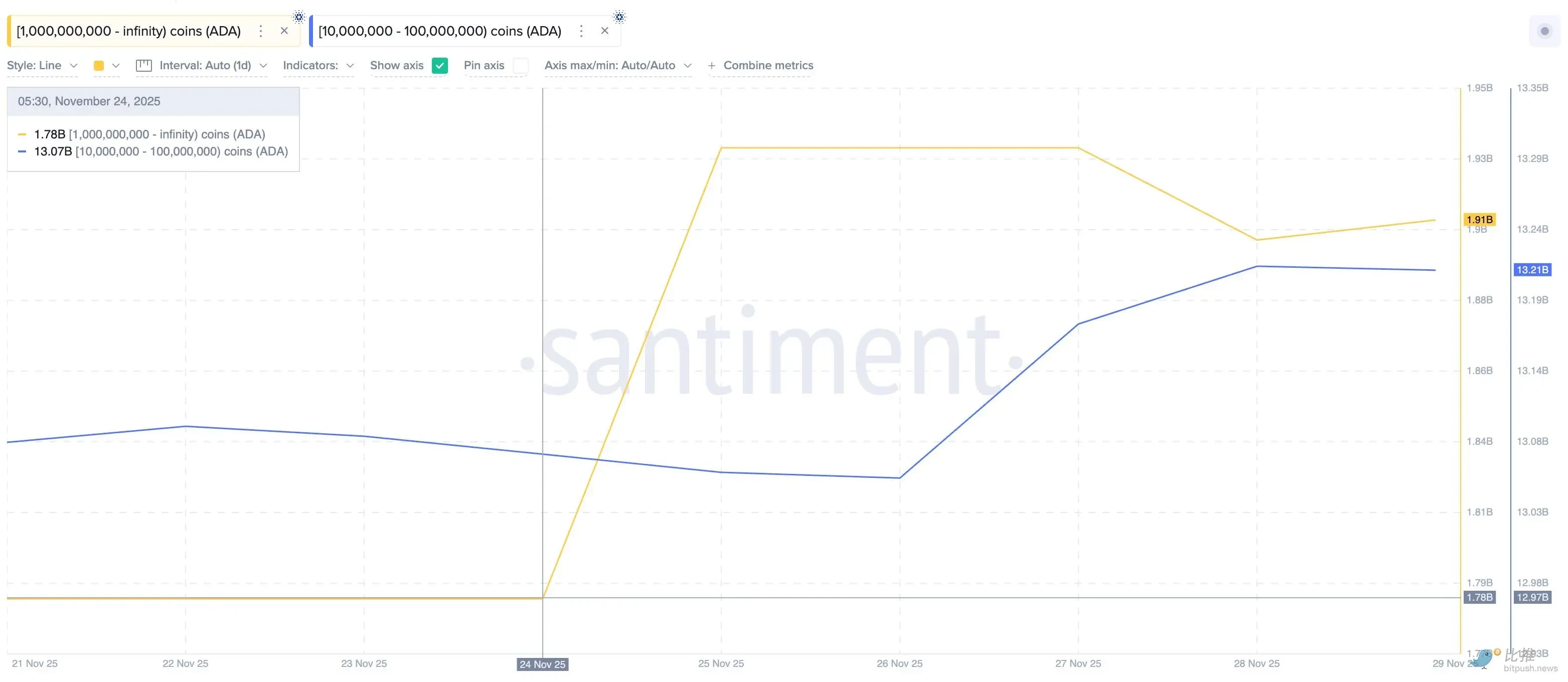 • 持有量最大的钱包(持有超过 10 亿枚)于 11 月 24 日开始增持,至今已累计增持 1.3 亿枚 ADA