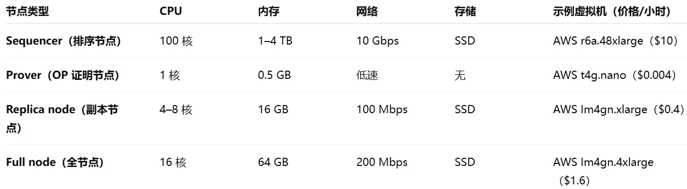 表中省略了 ZK 证明节点(ZK prover nodes) ,因为其硬件需求在很大程度上取决于具体的证明系统(proof stack),不同提供商之间的差异可能非常大。
