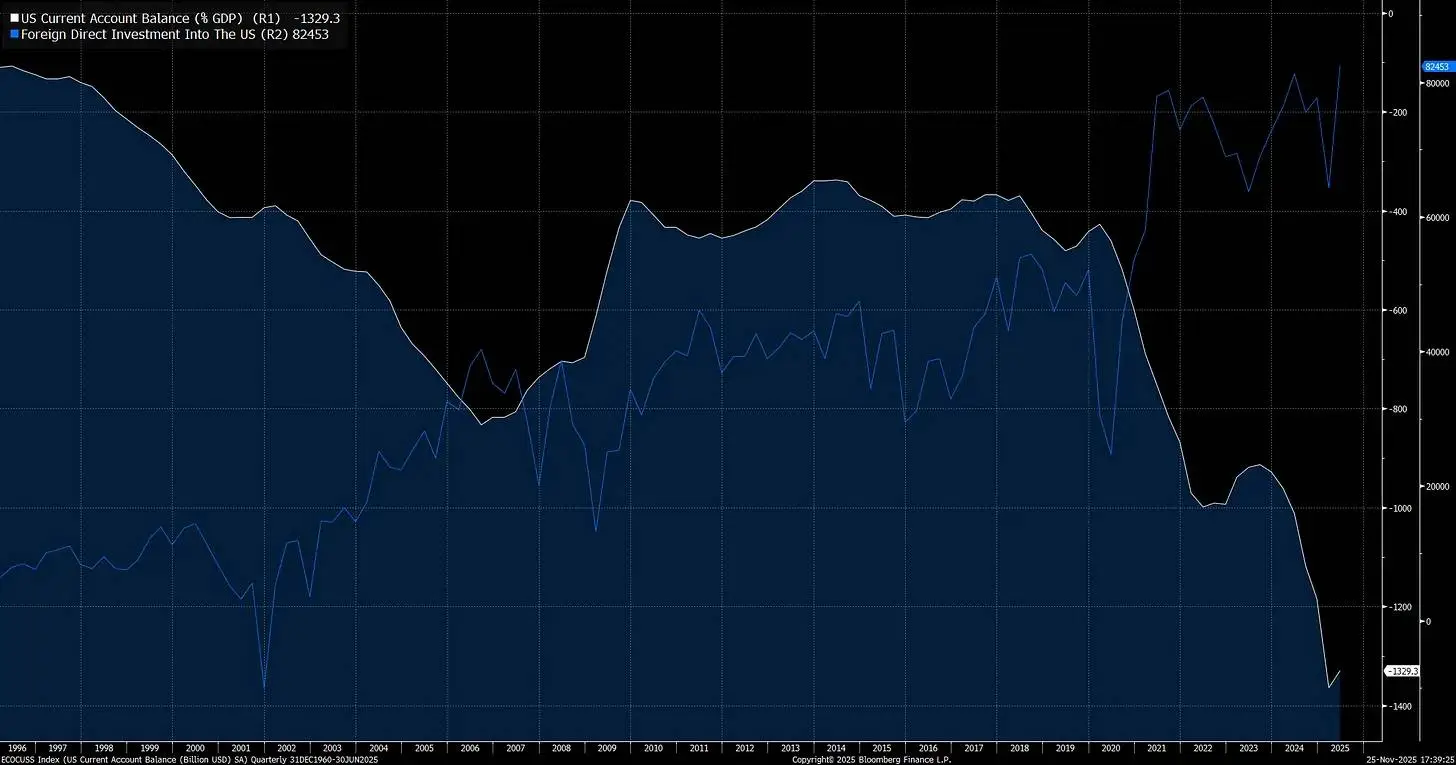 这一循环导致了严重的不平衡,美国的经常账户(进口与出口的差额,白线)已经处于极端状态。而这一现象的另一面是,外国对美国资产的投资(蓝线)也达到了历史最高水平: