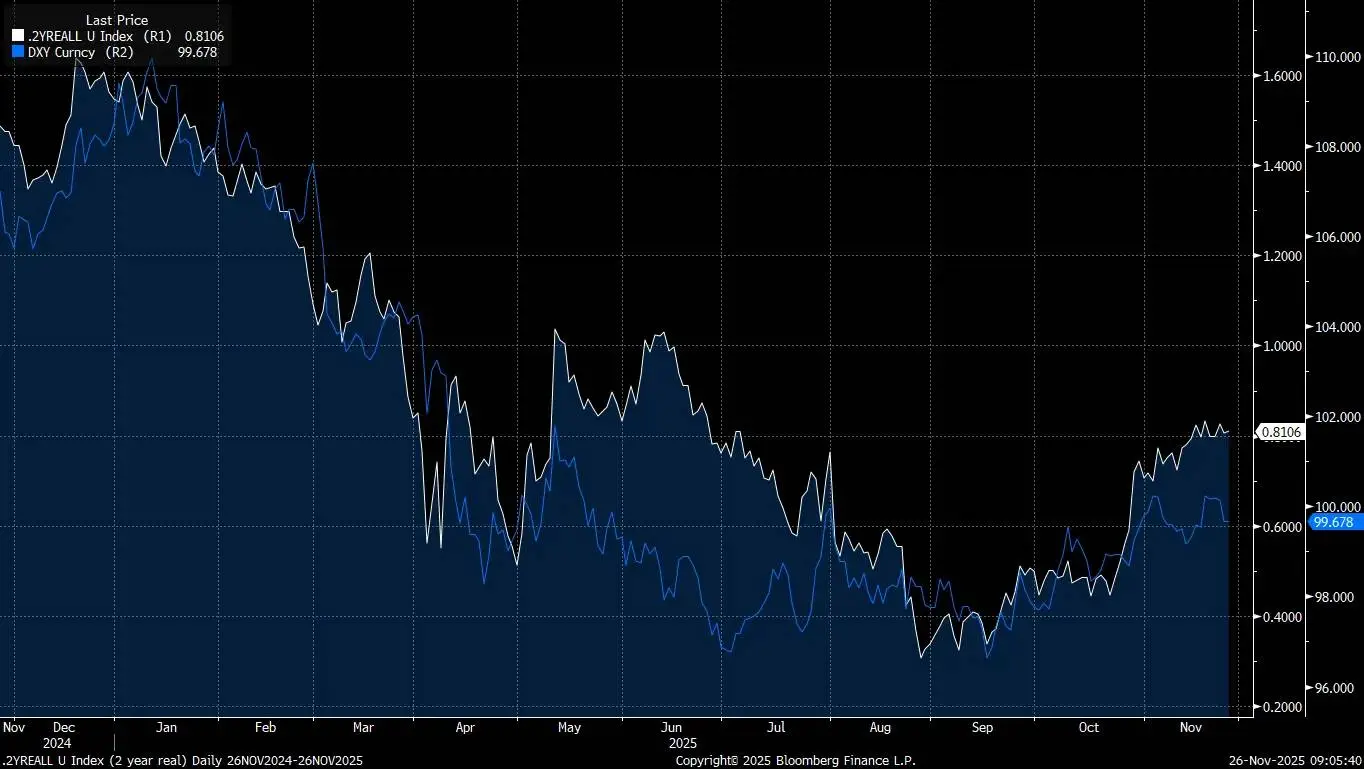 注意到短端实际利率(short-end real rates)是推动美元指数(DXY)的主要因素之一,这意味着货币政策与特朗普的关税政策共同成为这一趋势的关键驱动因素。