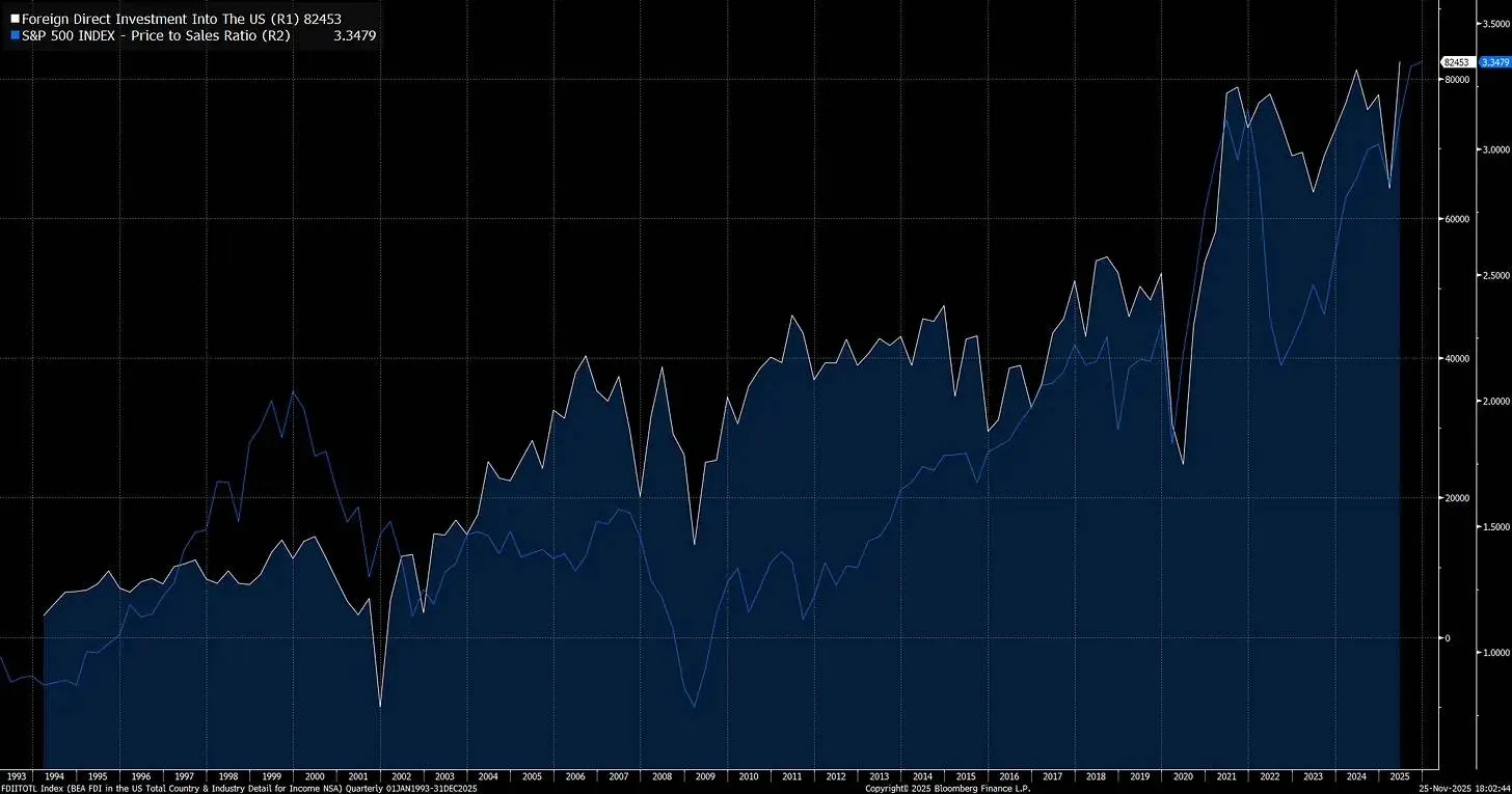 当外国投资者为了继续向美国出口商品和服务而不加选择地购买美国资产时,这正是为什么我们看到标普500指数的估值(市销率)达到了历史新高的原因: