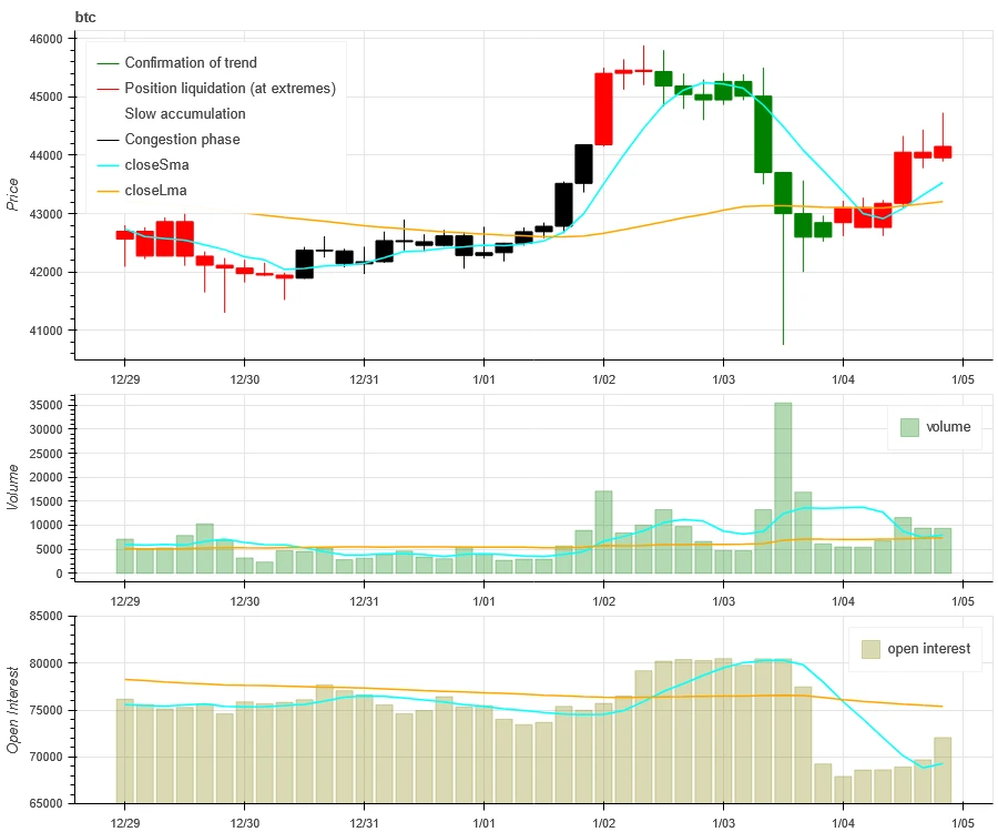 上图最上方 BTC 的价格走势,中间是成交量、最下方是未平仓量、浅蓝色是 1 天均值,橘色是 7 天均值。其中 K 线的颜色代表当前的状态,绿色是价格上升有成交量支持,红色是在平仓,黄色是在缓慢累积仓位,黑色是拥挤状态。