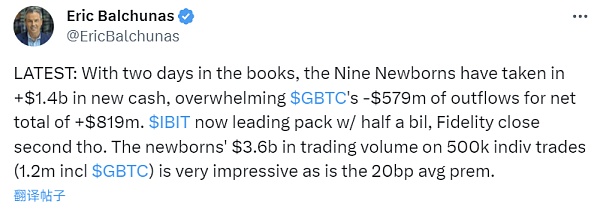 译文:截至目前为止,Nine Newborns已经吸引了14亿美元的新资金,远超过GBTC的5.79亿美元的资金流出,净流入额达到8.19亿美元。目前,IBIT领先其他,拥有50亿美元,而Fidelity紧随其后。新生的交易量达到36亿美元,涉及50万笔个体交易(总交易量包括GBTC在内为120万笔),这一表现令人印象深刻,平均溢价率为20个基点。