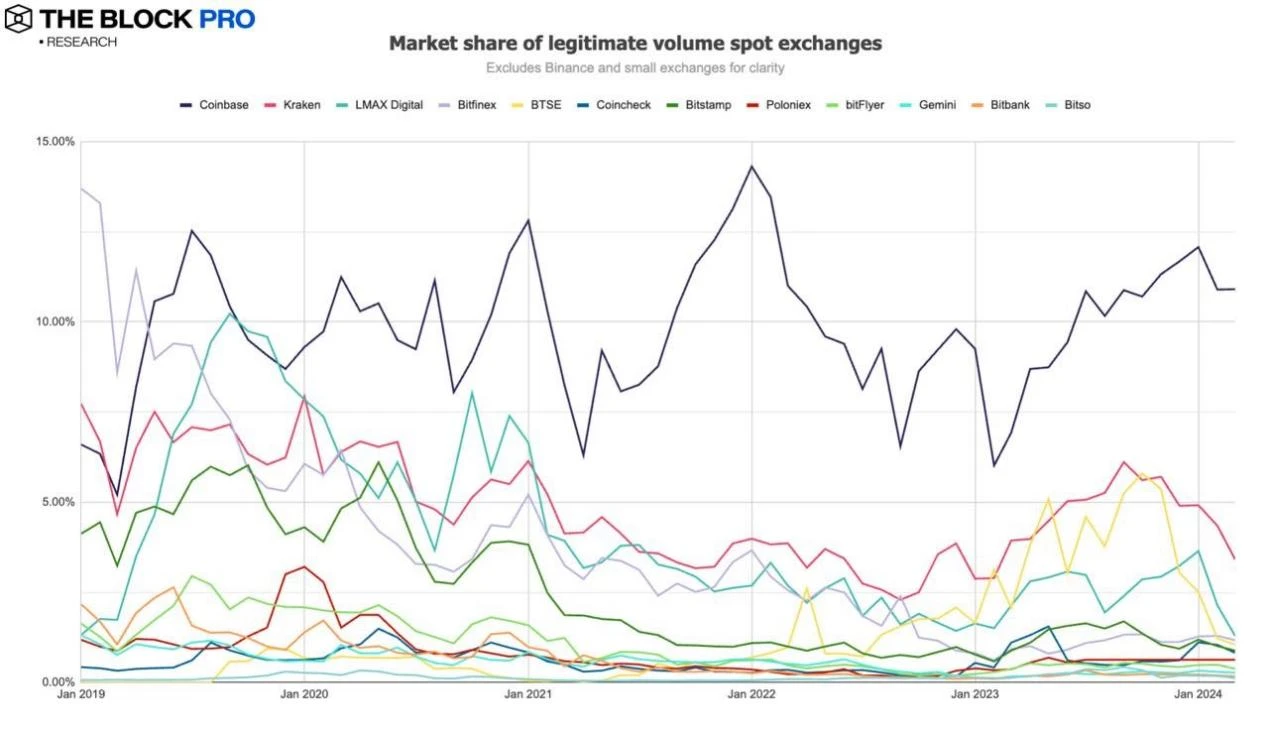 7、 3 月各大加密货币交易所的现货市场份额排名如下:币安为 78.5% (较 1 月和 2 月均有所上升)、Coinbase 为 10.9% 、Kraken 为 3.4% 、LMAX Digital 为 1.3% 。