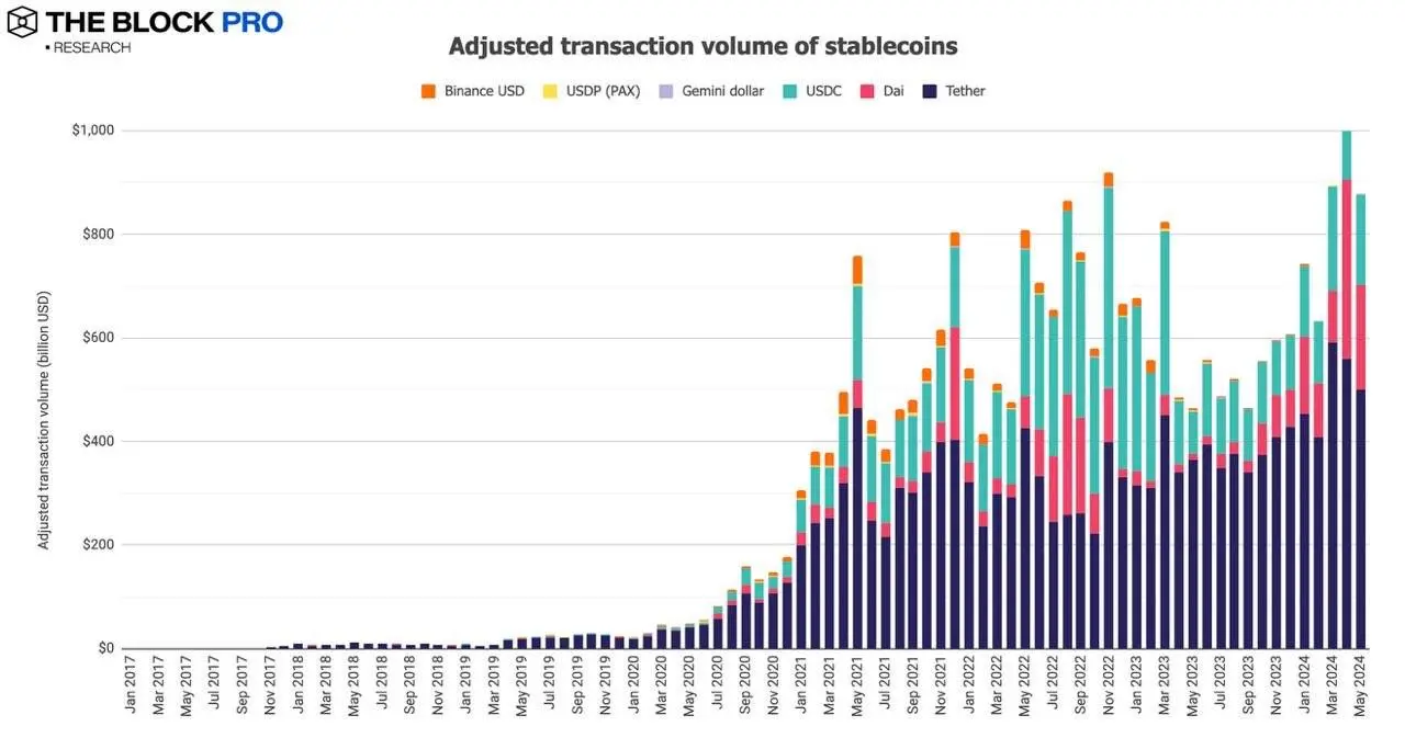 2、五月调整后的稳定币链上交易额下降了 20.5% ,跌至 8790 亿美元;已发行稳定币供应规模有所增加,涨幅为 0.5% ,升至 1419 亿美元,其中美元稳定币 USDT 市场份额占比增长到 78.8% ,而 USDC 的市场份额则小幅下降至 17.1% 。
