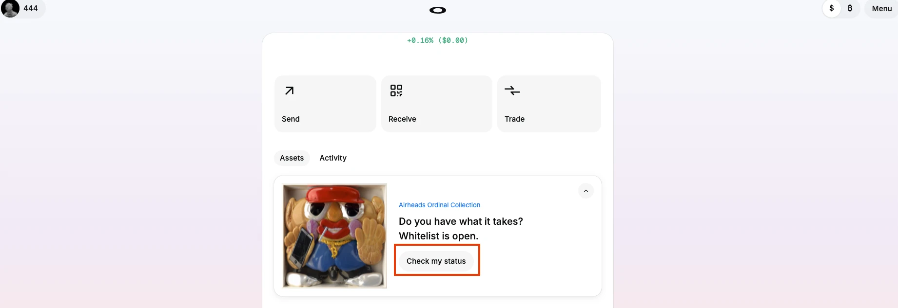 在 Oyl Wallet 钱包页面点击“check my status”来申请白名单,如下图。