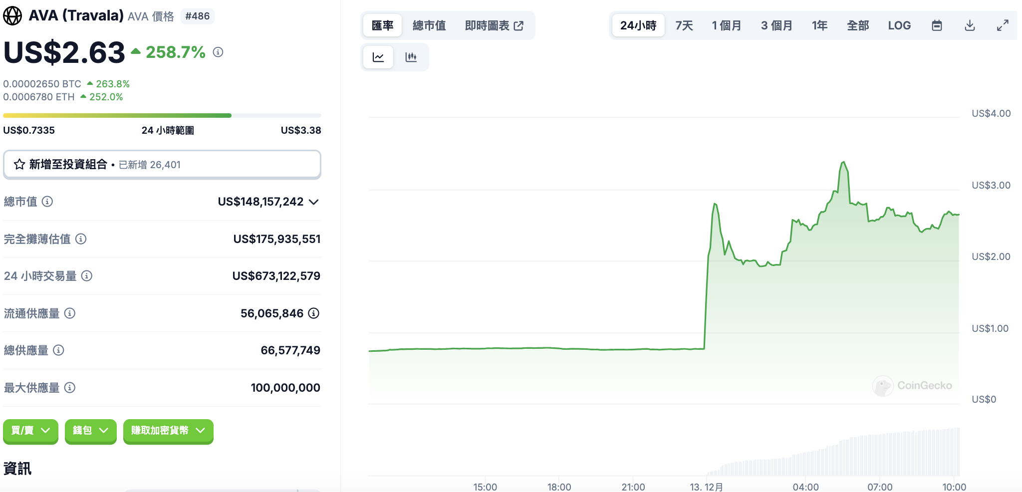 截稿前 AVA 幣價暫報 2.63 美元,近 24 小時上漲 258.7%。