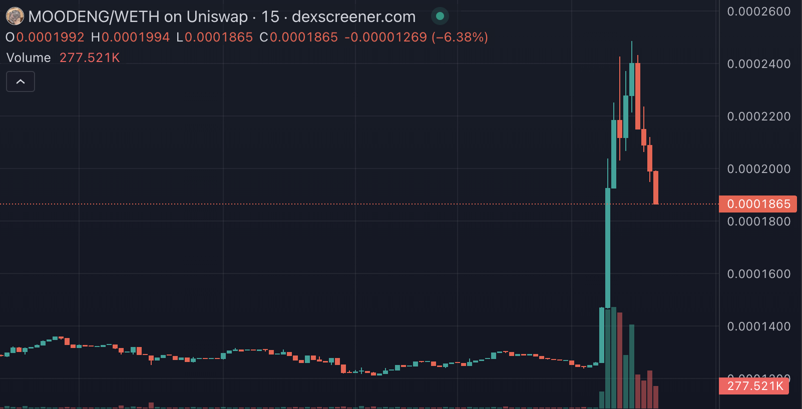 受此消息影響,以太坊同名迷因幣 Moodeng 從 0.000126 美元飆漲至最高 0.0002487 美元,漲幅高達 97.3%。截稿前現報 0.0001865 美元,近 24 小時上漲 48.63%。