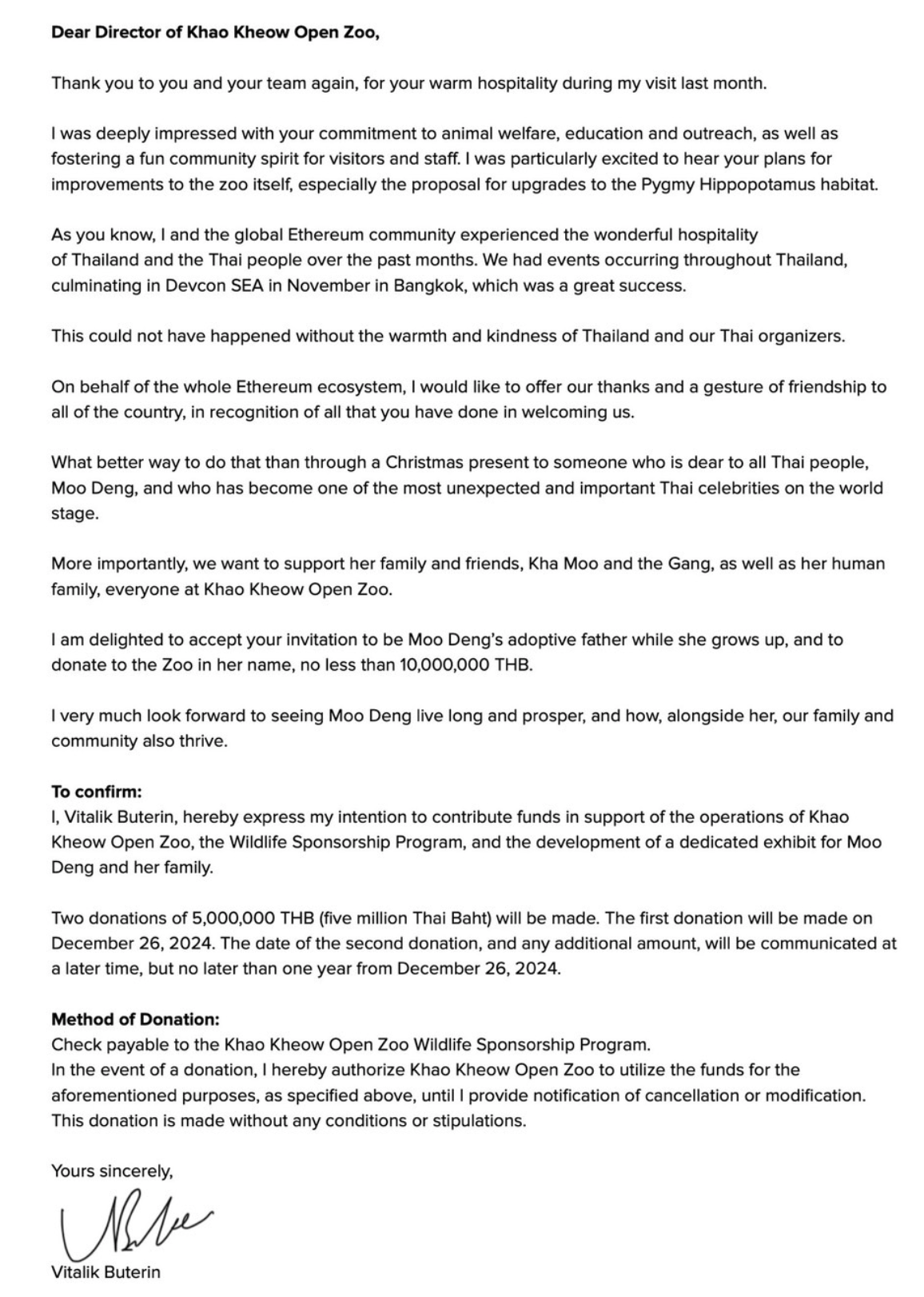 我,Vitalik Buterin,特此表達我的意圖,捐款支持 Khao Kheow 開放式動物園的運營、「野生動物贊助計劃」以及 Moo Deng 和她家族專屬展區的發展。