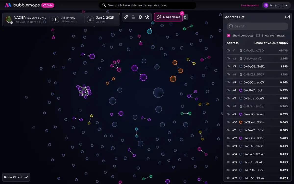 在这份名单中,$VADER 是前 10 个集群持有比例最低的 Token,仅为 10%。