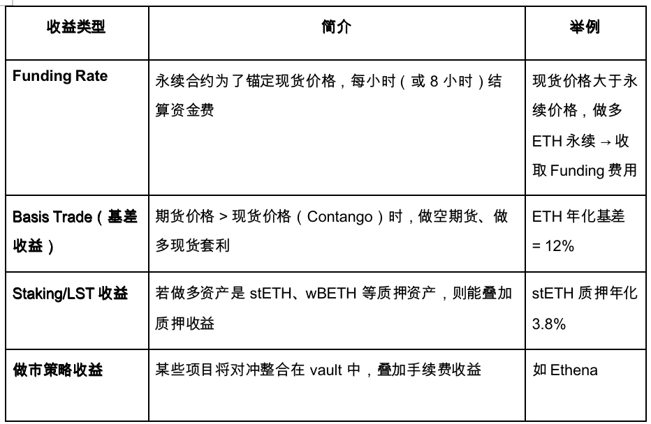 衍生品对冲利率(也称为 Delta-neutral 利率)是一种基于衍生品市场构建的收益来源。它通过同时持有正向和反向头寸来锁定价格方向风险(Delta),而赚取来自资金费(Funding Rate)或期货价格与现货价格的价差收益。在衍生品市场中,永续合约(Perpetual Futures)为主要对象。有以下几种收益类型: