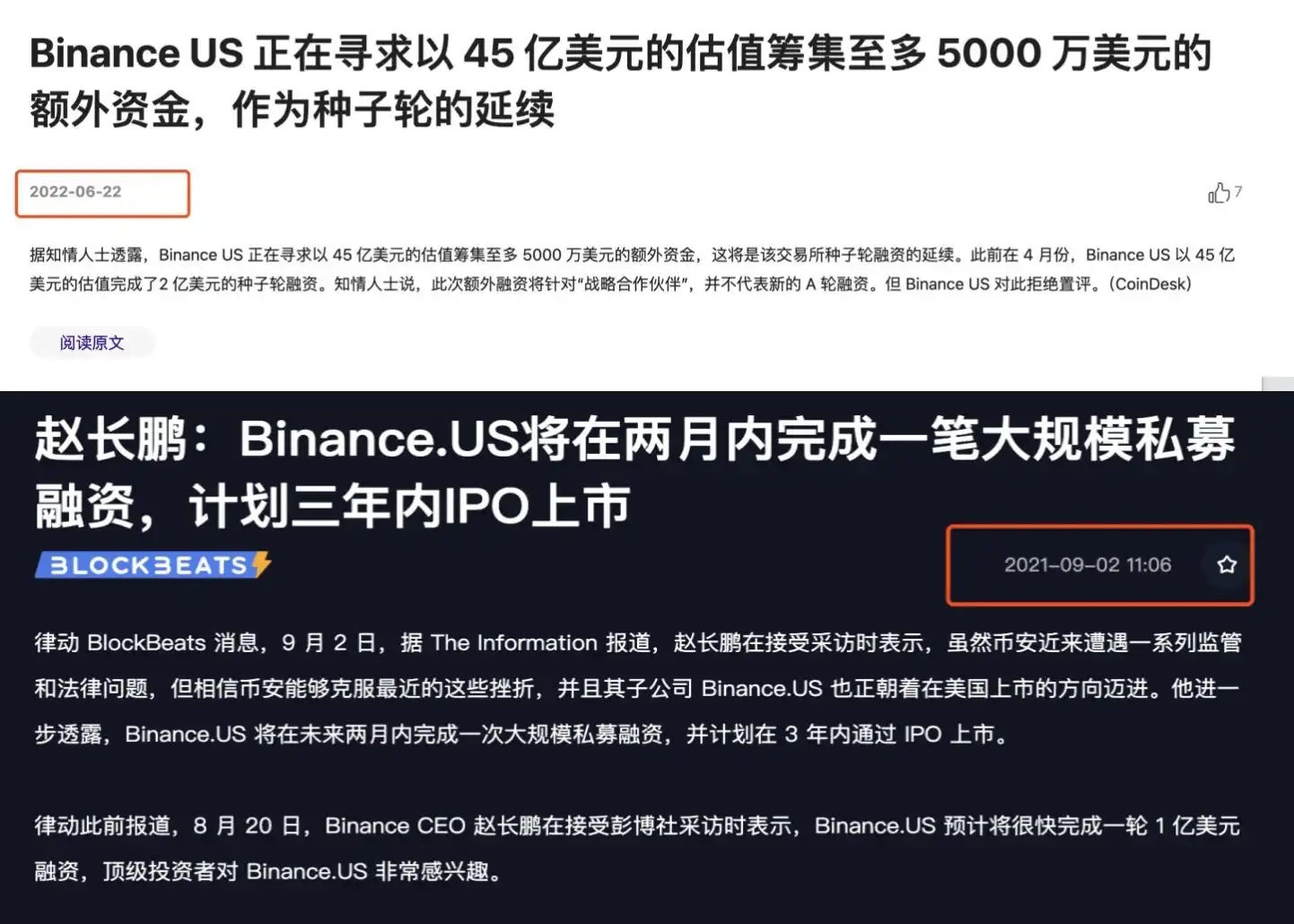 但到了 2021 年,CZ 表示 Binance.us 正朝着 IPO 方向迈进,并计划三年内完成上市。2022 年,市场也曾传出 http://Binance.us 正寻求以 45 亿美金估值融资。