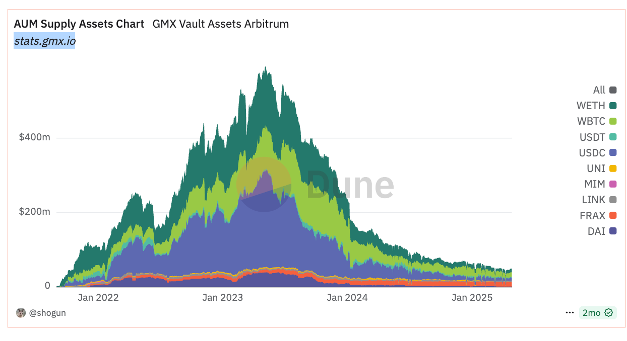 從下面這張圖可以清楚的看到,GMX 在 Arbitrum 上的資產管理規模,從 23 年底開始就已經出現了快速下滑的勢頭,截止 4 月份的數據 30-40M 左右,離巔峰期相去甚遠。
