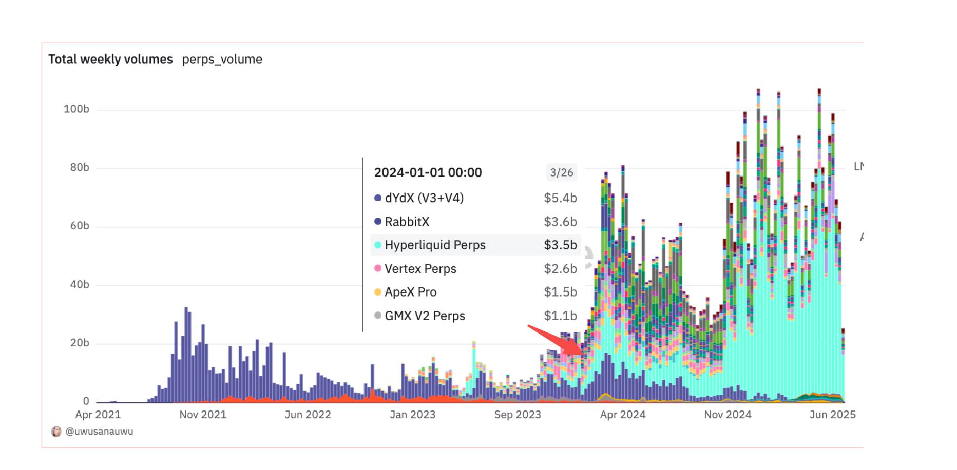 而這個下滑的時間點,正好與 Hyperliquid 的崛起時間重疊。