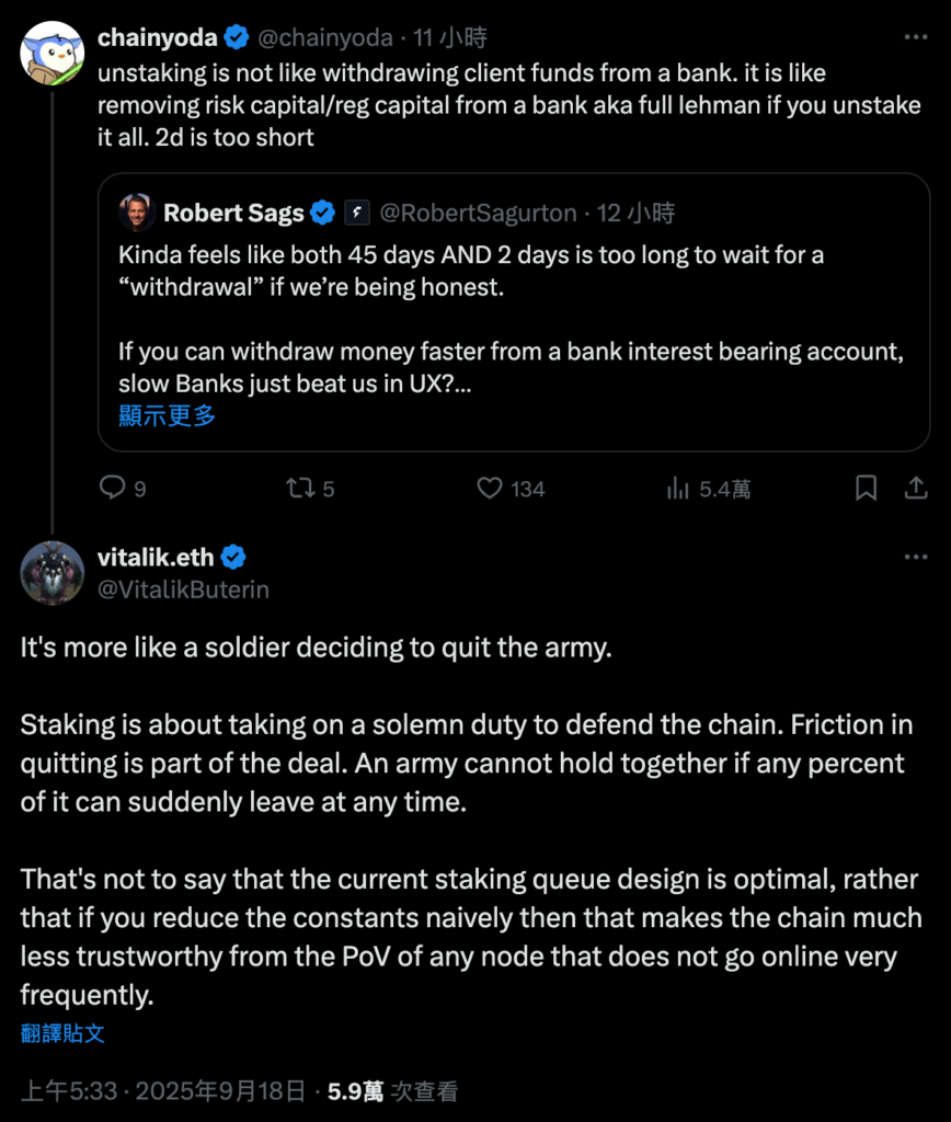 以 太坊傳出質押退出大塞車狀況,引發部分以太坊支持者不滿,共同創辦人 Vitalik Buterin 今(18)親上火線在社群平台回應質疑,V神指出,質押不是單純存提款,而是「保衛鏈的莊嚴責任」,退出的摩擦本身就是保障網路穩定性的設計。
