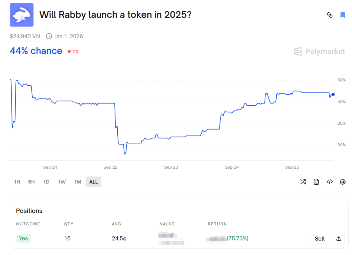 9 月 24 日,市場押注 Rabby 今年發幣概率一度飆升至 44%。