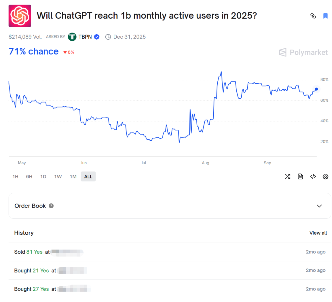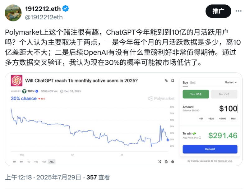 小編個人比較關注 Polymarket 上的三四個熟悉的垂直領域,包括 Crypto、科技、川普以及聯準會降息,其中部分下注機會需每日進行掃描。舉例而言,小編在 7 月 29 日發現,科技頻道中發現非常有趣的賭注市場:ChatGPT 會在 2025 年月活達到 10 億嗎?