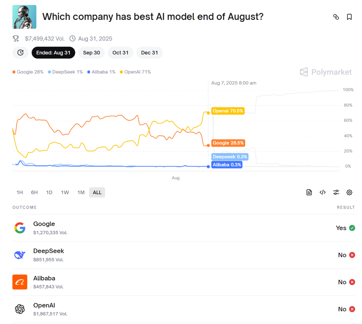 小編在 8 月初發現有關「9 月 1 日前最牛 AI 模型的押注」。當時谷歌領先,而 OpenAI 則遠遠落後,小編發現隨著 ChatGPT5 的推出,OpenAI 肯定有機會。