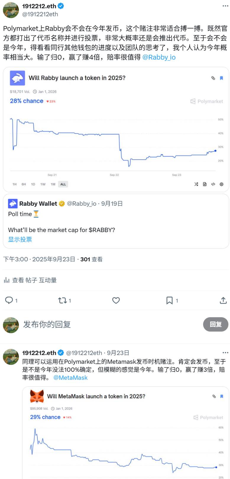 9 月 23 日,小編在掃描 Polymarket 上的加密預測市場時,偶然發現竟然有 Rabby 以及小狐狸 MetaMask 的發幣時間預測。