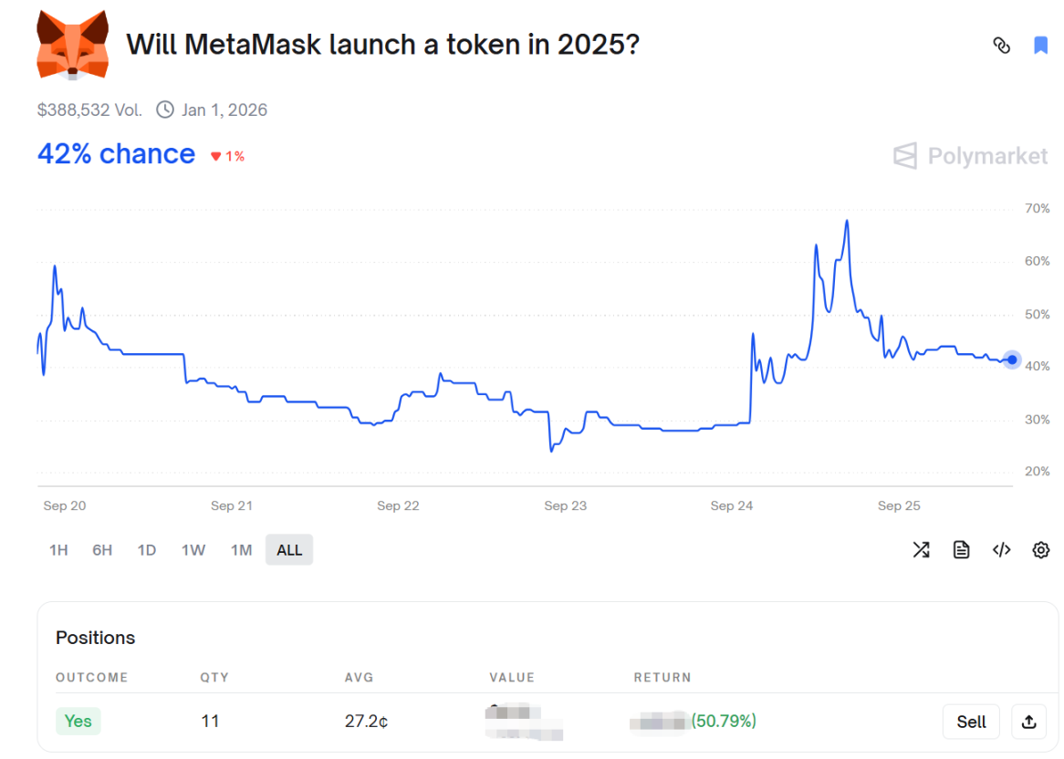 市場押注 MetaMask 今年發幣的概率,甚至一度飆升至 68%。
