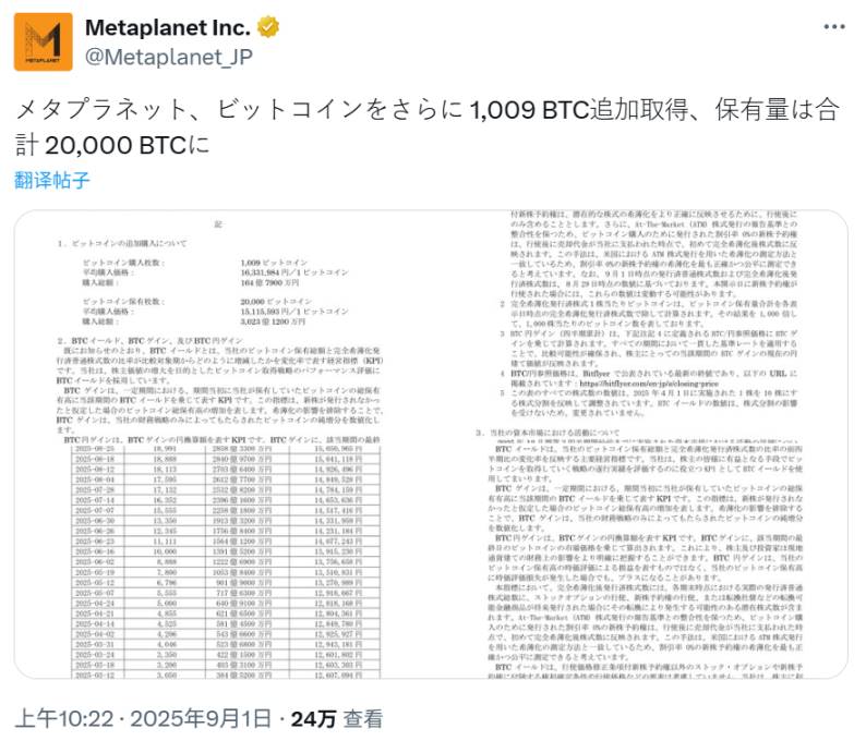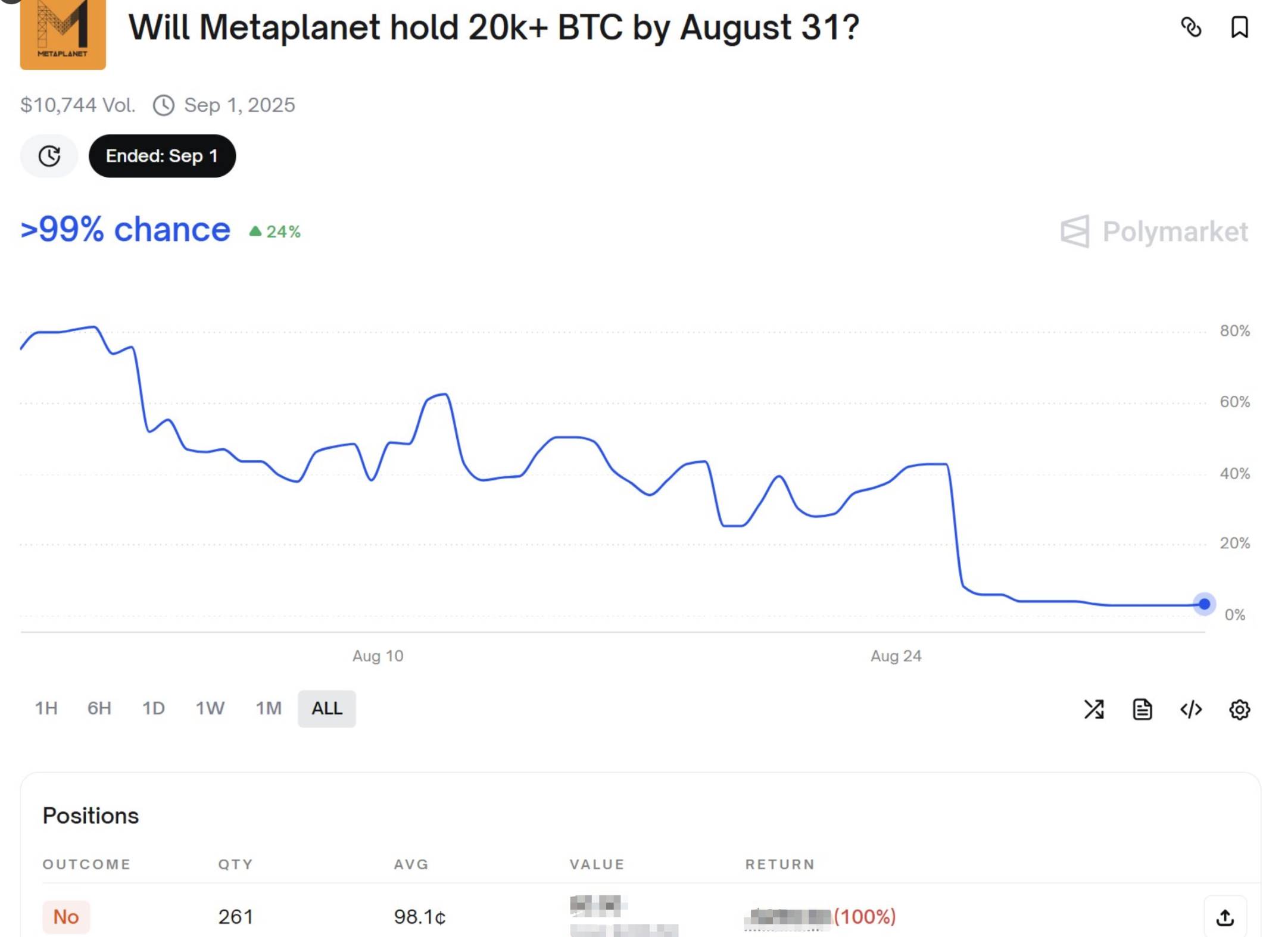 8 月 30 日晚間,小編注意到一個賭注:日本上市公司 Metaplanet 時是否會在 8 月 31 日 11:59 PM ET(美國東部時間)持有 2 萬枚 BTC。當時市場押注概率 NO 的概率已飆升至 98%。要知道在 8 月 25 日時,其宣布加倉了 103 枚 BTC,總持有量為 18991 枚 BTC,距離 2 萬枚仍有超 1000 多枚。