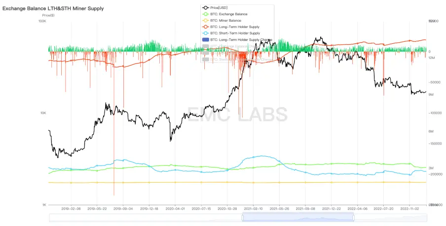 FTX 等機構的破產加劇了市場見底,但決定週期終結的根本力量卻是長手群體(長期投資者)的止盈拋售。在市場狂熱時短手搶籌而長手拋售,在市場冷卻時短手拋售而長手轉而增持。