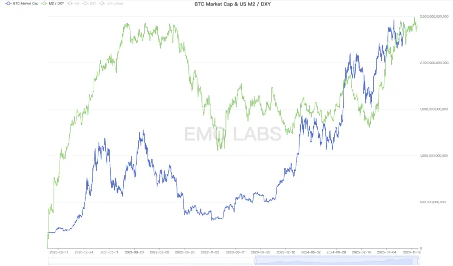 加息週期臨近尾聲,銀根緊縮導致美國區域銀行(矽谷銀行、第一共和銀行)出現破產案例,美國政府被迫緊急釋放流動性。美國 M2/DXY 指數開始觸底反彈,為美國股市及 BTC 觸底反彈提供了外部環境。