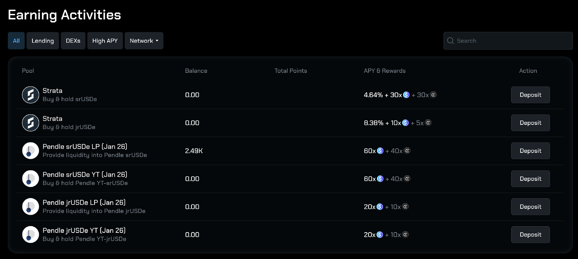 曾参与过 Strata 的 Season 0 预存款的用户可以将当时的凭证代币 pUSDe 铸造为 srUSDe 或 jrUSDe,并在 Pendle 上将 pUSDe LP(本来明天也会到期)迁移至新的 srUSDe LP 或 jrUSDe LP 池。
