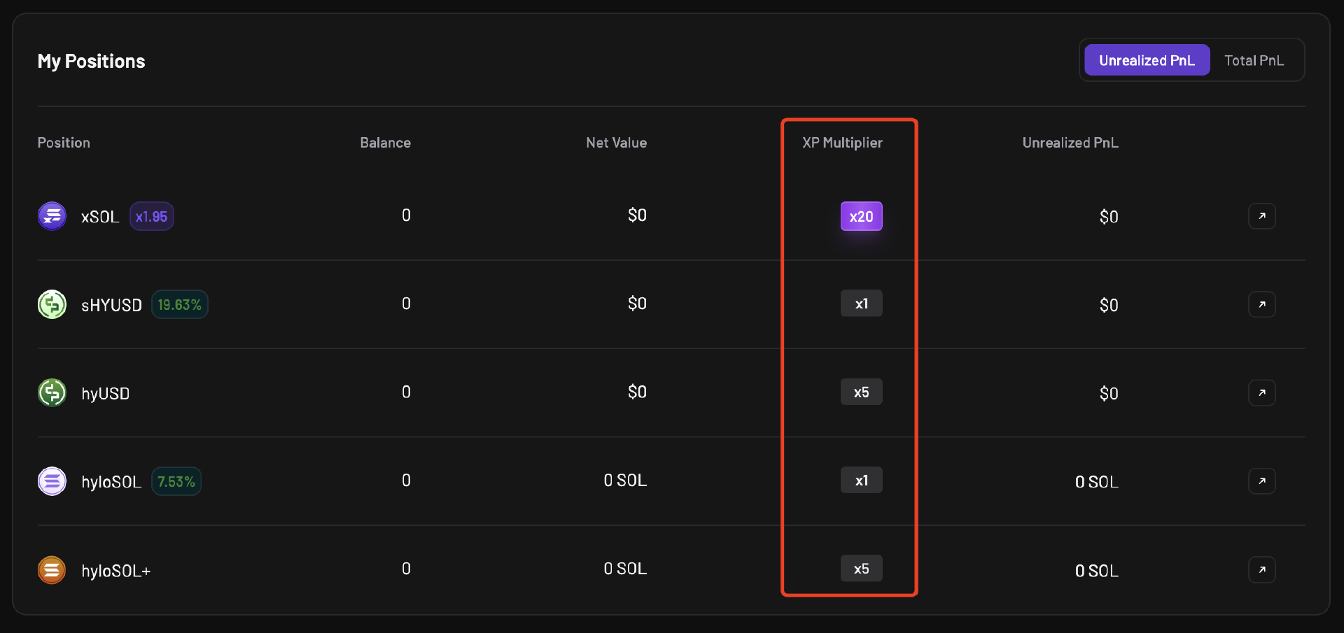 仅关注稳定币的话, hyUSD 本身并不会生息,静态持有可获得 5 倍的积分效率;sHYUSD 的年化暂报 19.66%,但静态持有仅有 1 倍的积分效率。