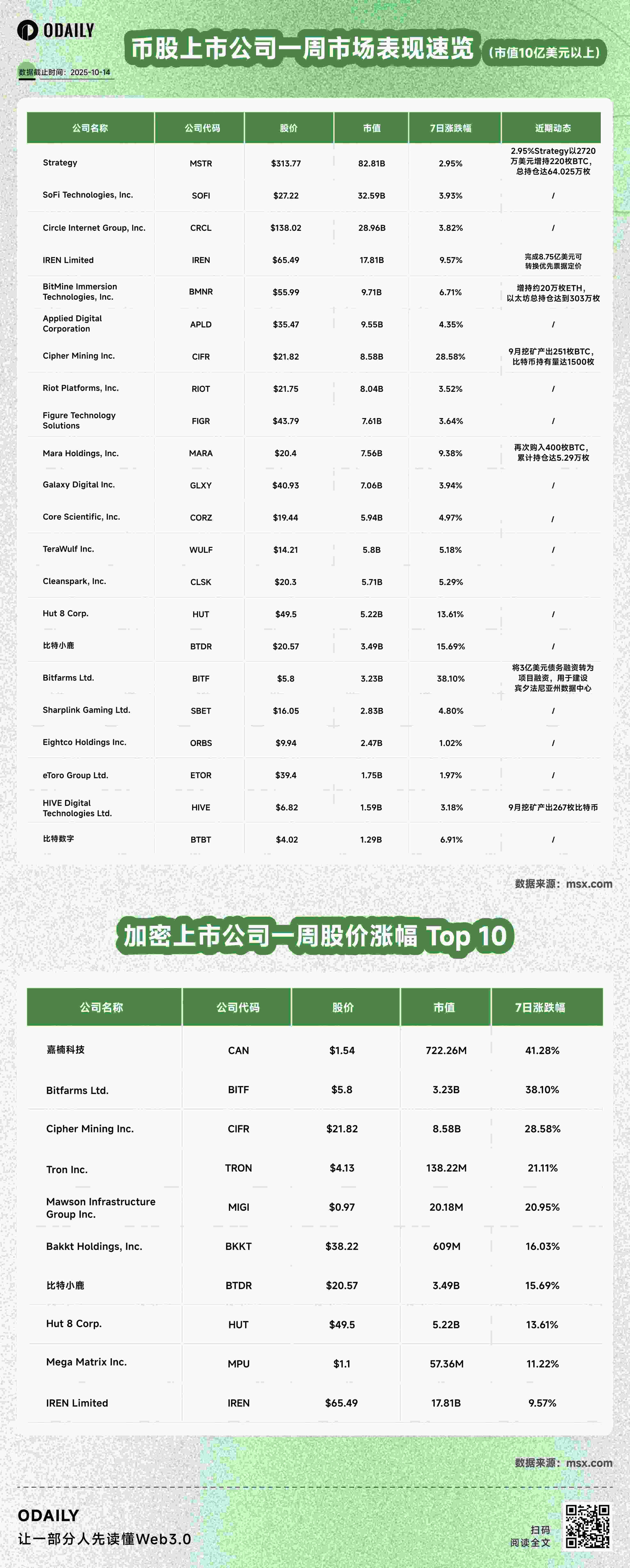 编者按:尽管上周六市场经历了一次多重因素的极速闪崩,但作为 DAT 策略的践行者,诸多执行囤币策略的上市公司不仅没有割肉止损,反而投入了更多资金抄底,足见传统金融领域对于加密市场后续走向的信心。除此以外,还有不少上市公司陆续完成融资、股权派息并买入各类山寨币。目前来看,上市公司仍然是市场买盘的重要力量。以下为 Odaily 星球日报总结整理的上周币股市场信息, 所有美股数据皆来自 msx.com