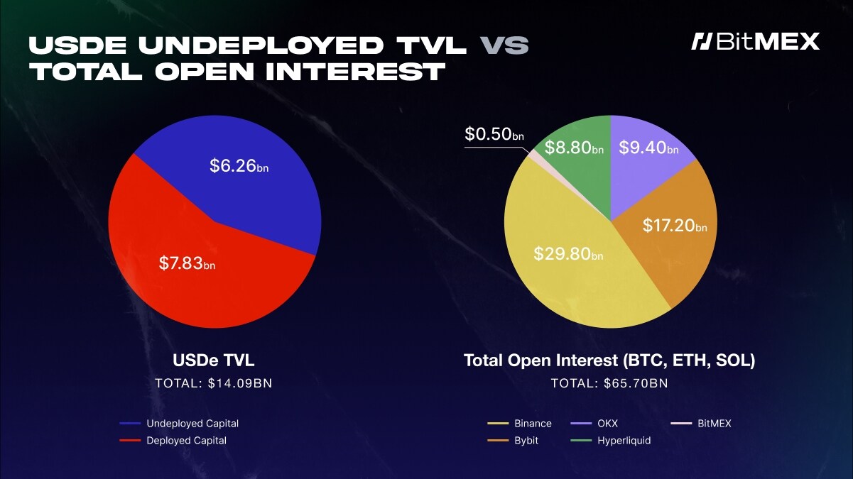 图 2:2025 年 9 月 25 日 Ethena (USDe) 锁定总价值与各大加密货币交易所 BTCETH 和 SOL 的总未平仓合约量