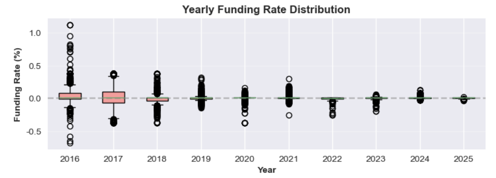 多年来,随着市场深化和更多机构资本的流入,这种波动性逐渐减弱。 2024-2025 年周期确立了新的常态:平均资金费率目前稳定在 0.01%/8 小时的基线附近徘徊。 这种情况发生在永续合约溢价极低时,导致费率默认与其利率成分挂钩——这是金融市场系统性高效的标志。