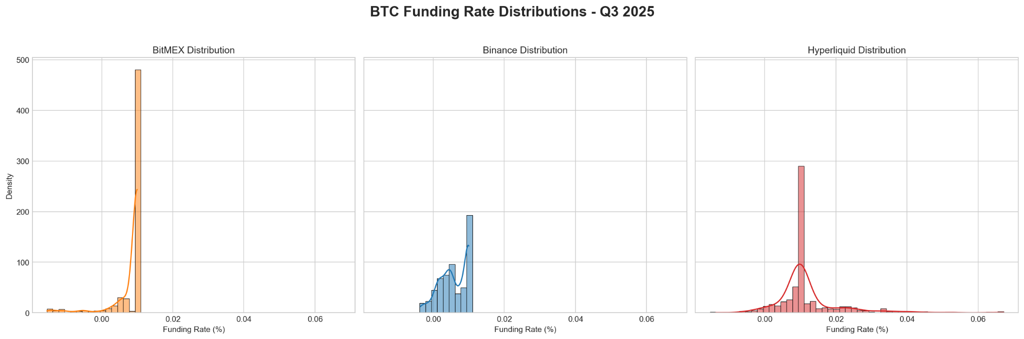 为了分析上述关于资金费率下限和上限的理论是否成立,我们分析了 BitMEX、币安和 Hyperliquid 2025 年第三季度的资金费率数据。这证实了上一节讨论的两个核心理论:
