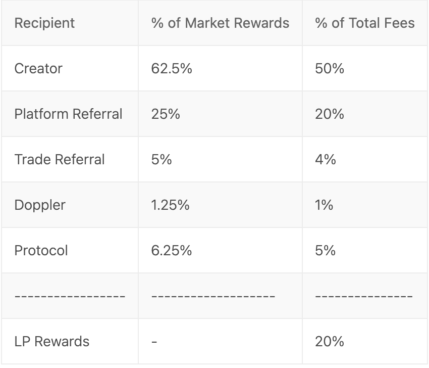 更核心的创新在 Zora 的收益分配模型设计上,Zora 平台上的代币交易费从早期的 3%下降至 1%,其中 50%直接支付给创作者,20%作为代币永久流动锁定,永久增加交易池子深度,20%奖励给推荐创作者部署代币的开发者/平台,4%作为特定交易地址奖励,5%进入平台国库。