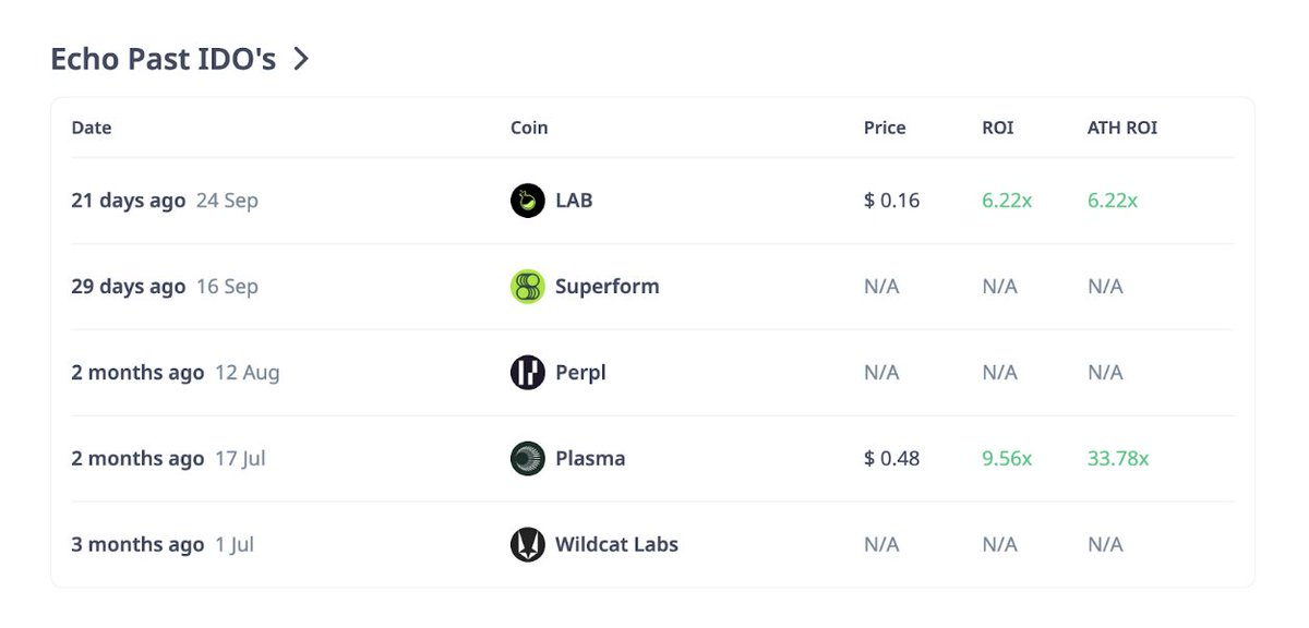 紧随其后的是 LAB,在上线时实现了 6.22 倍 ROI 的表现。以下是 Echo 近期发售项目的快照数据: