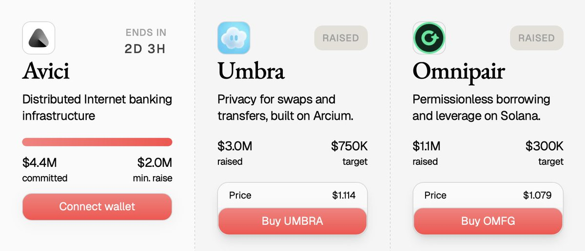 最具代表性的案例是 Solana 隐私协议 Umbra。Umbra 的公募吸引了 超过 10000 名参与者,该项目的销售吸引了超 1 万名参与者,认购金额突破 1.5 亿美元,销售页面实时公示了透明的大额认购数据,实现了完全透明的分配过程。这种实时透明、链上执行、机制驱动的分发体验,让人得以一窥更结构化的 IC0 未来。