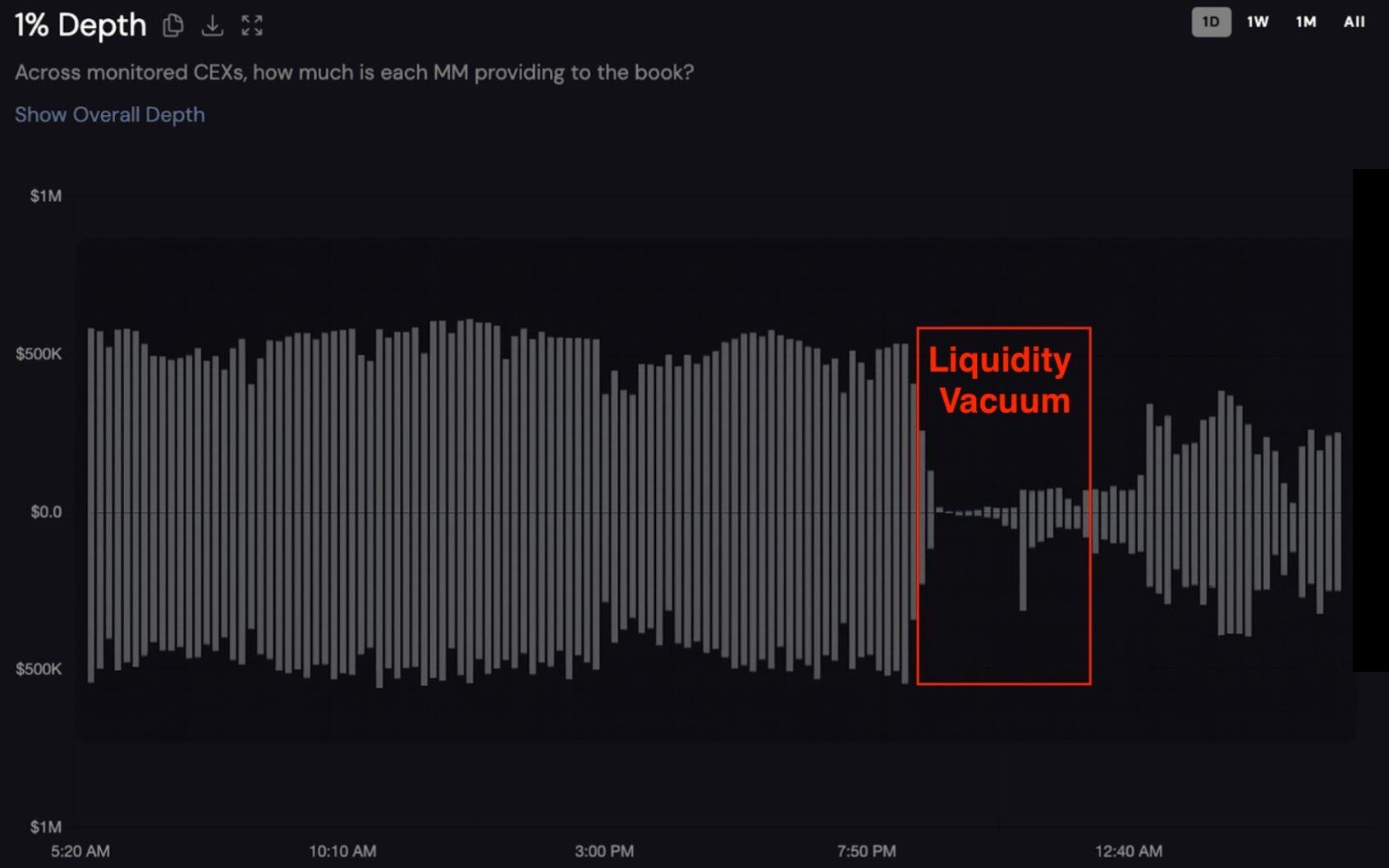 做市商通常会使用永续合约对冲库存,但在ADL发生作用时, 做市商也被迫在下跌的市场中持有裸多头仓位,因此撤回了所有流动性以止损。这导致原本流动性充裕的 24/7 永续合约市场恰恰在流动性最关键的时候蒸发了。
