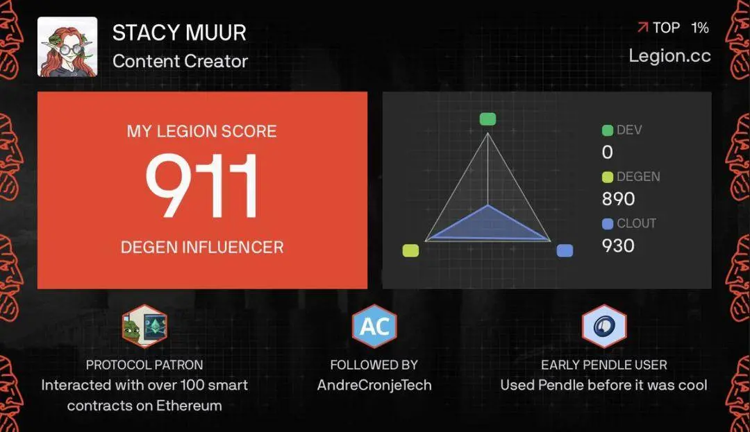 Legion 的核心是 Legion 评分机制—— 一个 0-1000 分的信誉指标,由链上活动、技术贡献(如 GitHub 提交)、社交互动和他人背书综合计算得出。