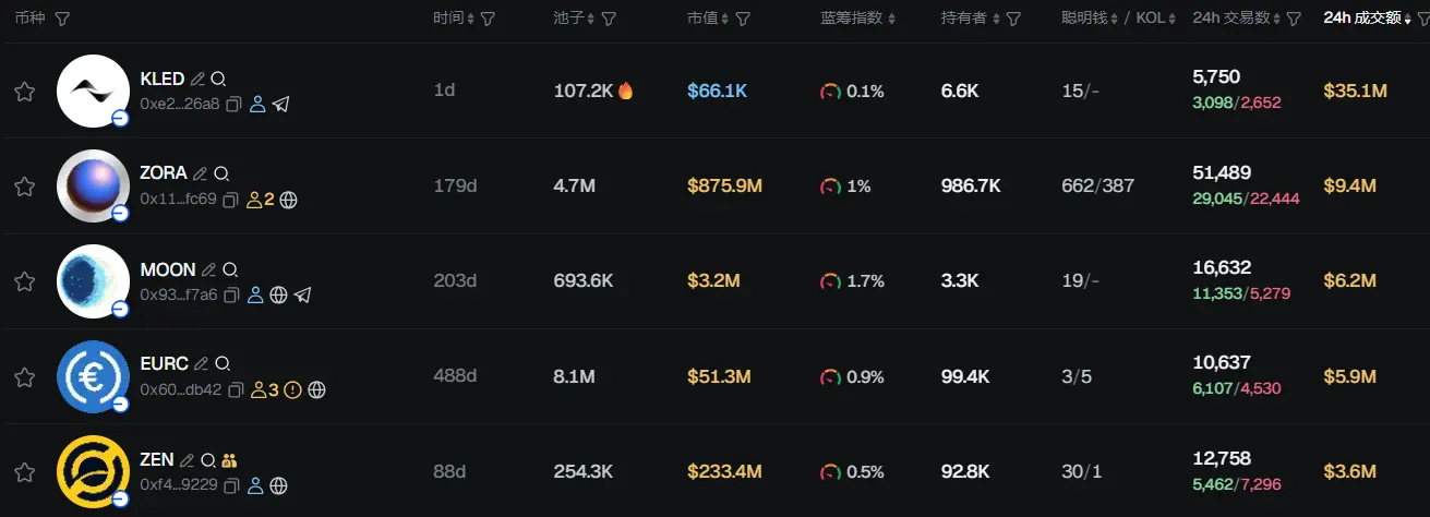 过去 24h Base 热门代币前五依次为:KLED、ZORA、MOON、EURC、ZEN