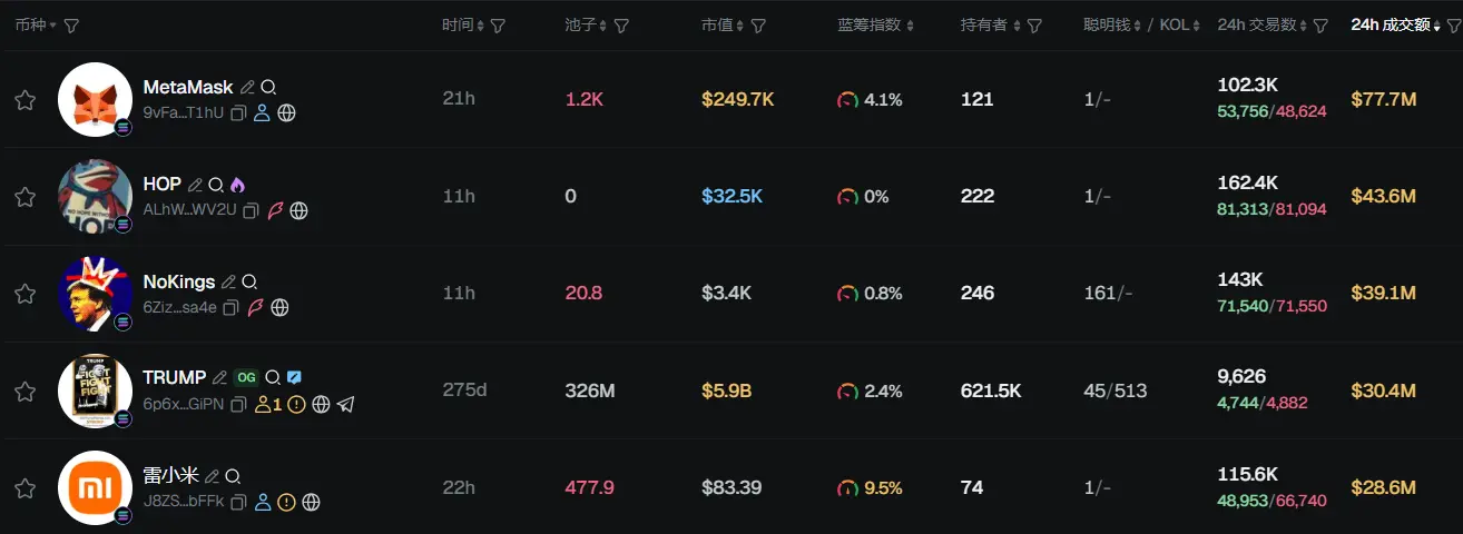 过去 24h Solana 热门代币前五依次为:MetaMask、HOP、Nokings、TRUMP、雷小米
