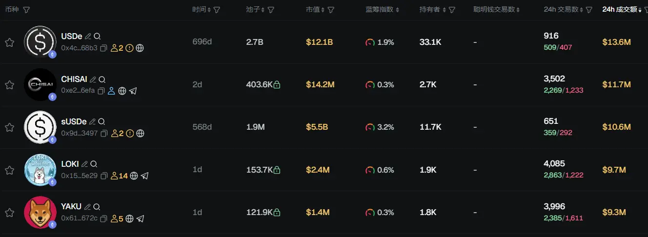 过去 24h ETH 热门代币前五依次为:USDe、CHISAI、sUSDe、LOKI、YAKU
